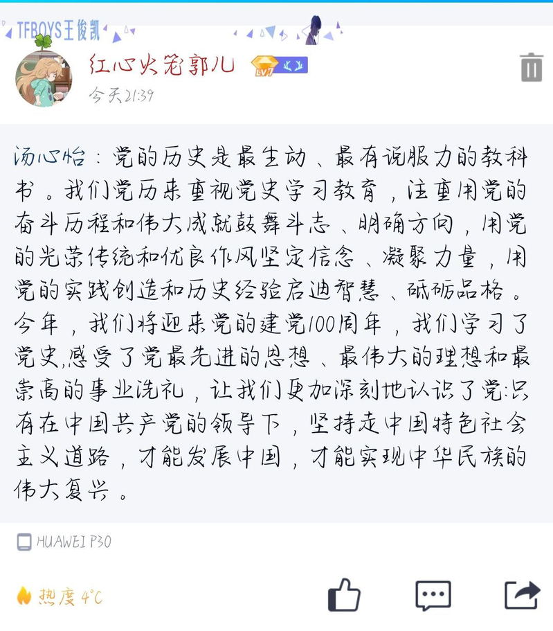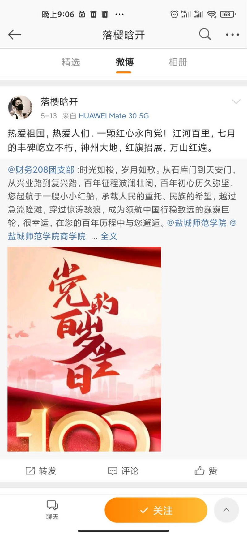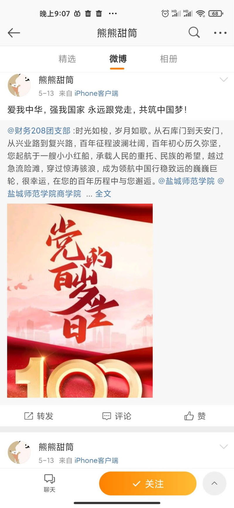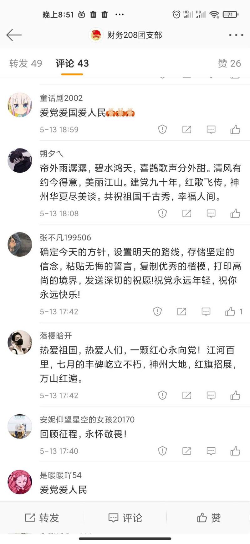 本次活动充分利用互联网新媒体,宣传委员在各支部官方微博开展读党史接力赛。宣委们带上#百年辉煌 E心向党#的话题,制作了精美的党史学习微博推文,并@下一个团支部进行接力,同学们积极响应,第一时间转发微博并在评论区留下学习心得。不仅如此,团支书还领头号召同学们在QQ微信等社交媒体跟学党史相关知识,同学们争相学习,使学习氛围变得浓烈起来。此外,商院小团子还分享了党史歌单,同学们合理应用下课之余的闲暇时光,仔细聆听歌曲里曲折又热血的党史故事。经过为期8天的学习后,同学们纷纷表示,每天有空就拿起手机刷刷党史小知识、看几个党史故事,很快就对党史有了更深刻的理解,开阔了眼界。