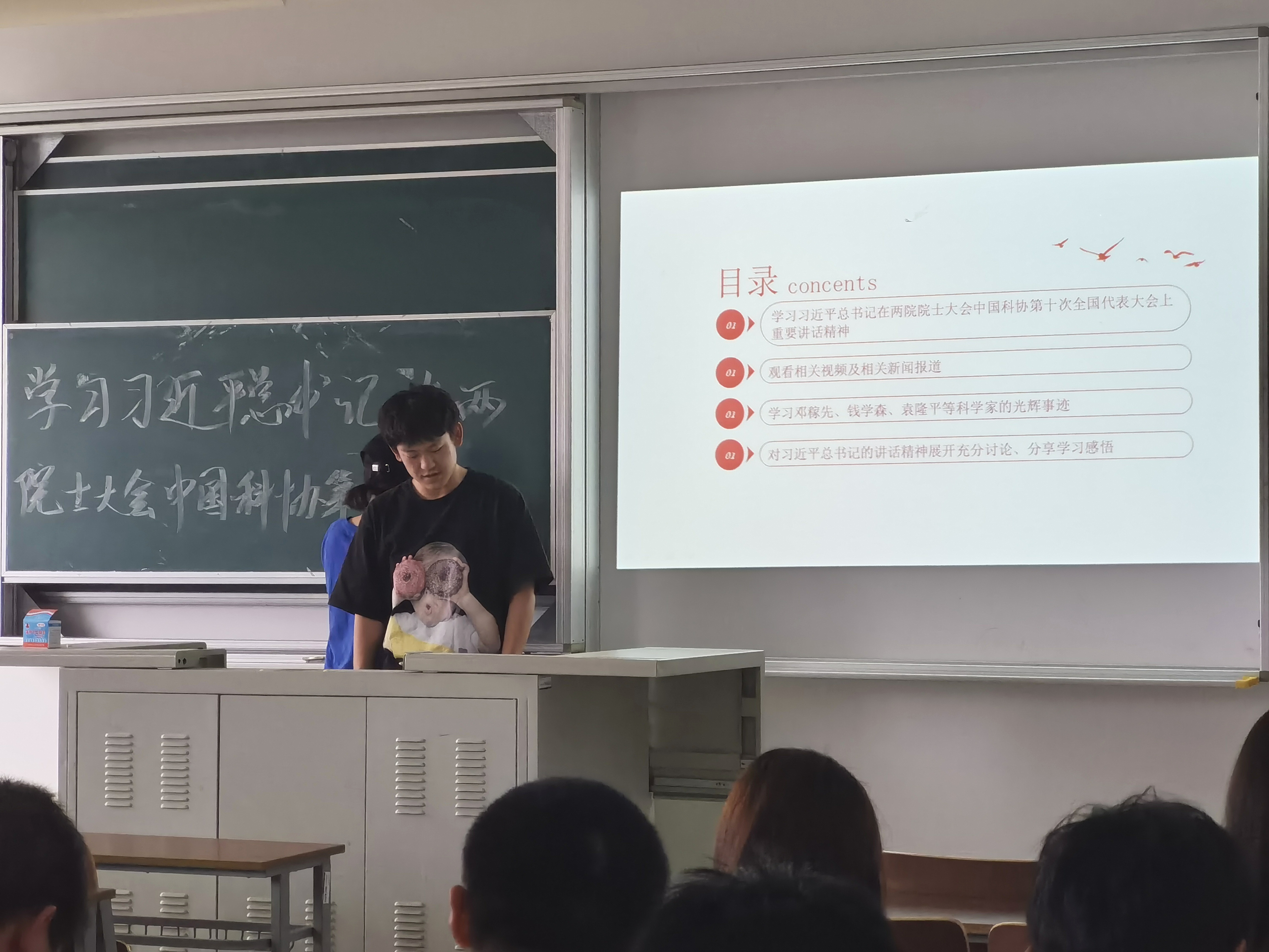 本次团日,各班团支书精心制作了PPT和视频,向同学们认真传达了习近平总书记在两院院士大会中国科协第十次全国代表大会上重要讲话精神,并组织同学们观看习近平总书记在两院院士大会中国科协第十次全国代表大会上重要讲话视频及相关新闻报道。团课中,同学们集中学习了“两弹元勋”邓稼先、“中国航天之父”钱学森、“杂交水稻之父”袁隆平等科学家为党为国家为人民坚持不懈进行科技创新的光辉事迹,更全面地了解了伟人们为国家做出的贡献。最后,同学们就习近平总书记在两院院士大会中国科协第十次全国代表大会上重要讲话精神展开深刻讨论、思考并分享了学习感悟。团课结束,同学们就本次团课学习写下了自己的学习心得。