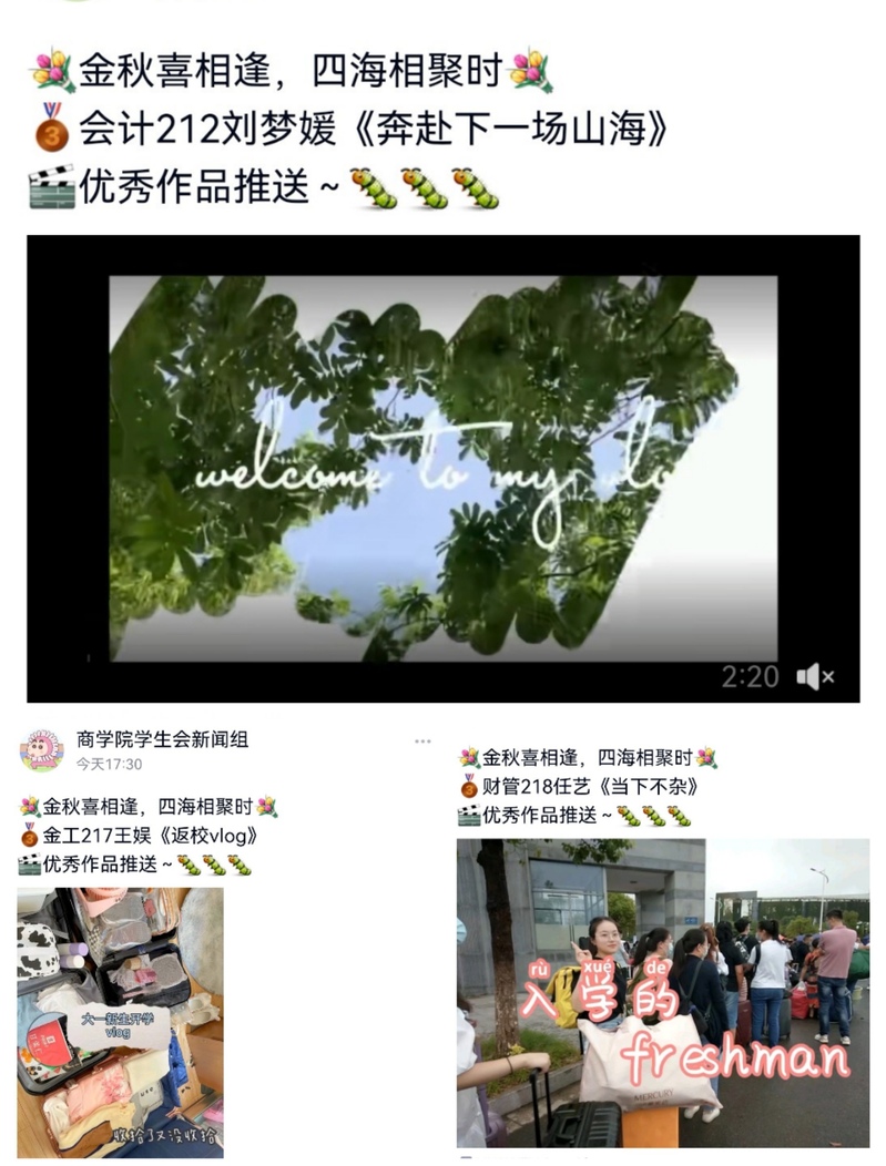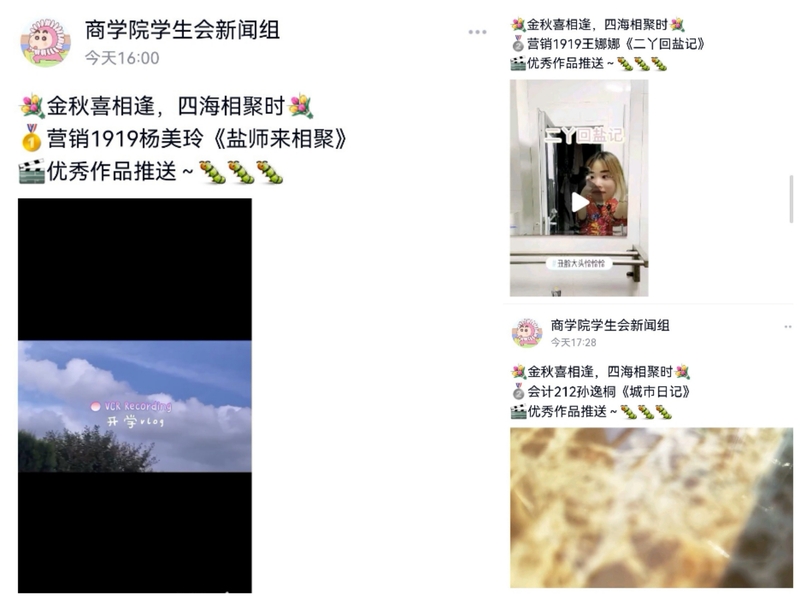 为鼓励学生在新一学年感受自我在盐师的存在,思考如何描绘自己成长成才的画卷,书写人生起步的篇章,商学院学生会新闻组于9月24日至10月4日组织进行“金秋喜相逢,四海相聚时”开学季短视频大赛。