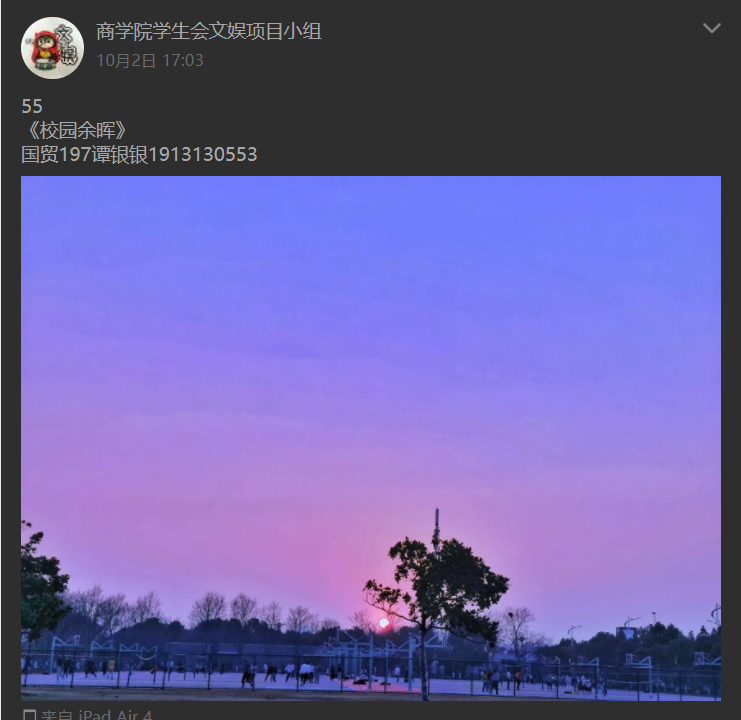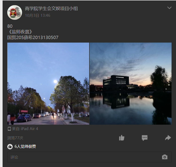 活动伊始便得到了同学们的踊跃参与。大家纷纷拿出手机记录校园美景,从镜头重新认识我们,校园有唯美的落日、有照亮学生夜跑的灯光、还有美轮美奂的校园建筑⋯⋯此次活动共征集到500份作品,经过一天的网上展示并收集点赞,营销195班的谢国梁同学最终以743赞的绝对票数获得本次活动的第一名;第二第三名的张文斌和陆叶则都是来自会计1915班获得了同样的489票的票数。