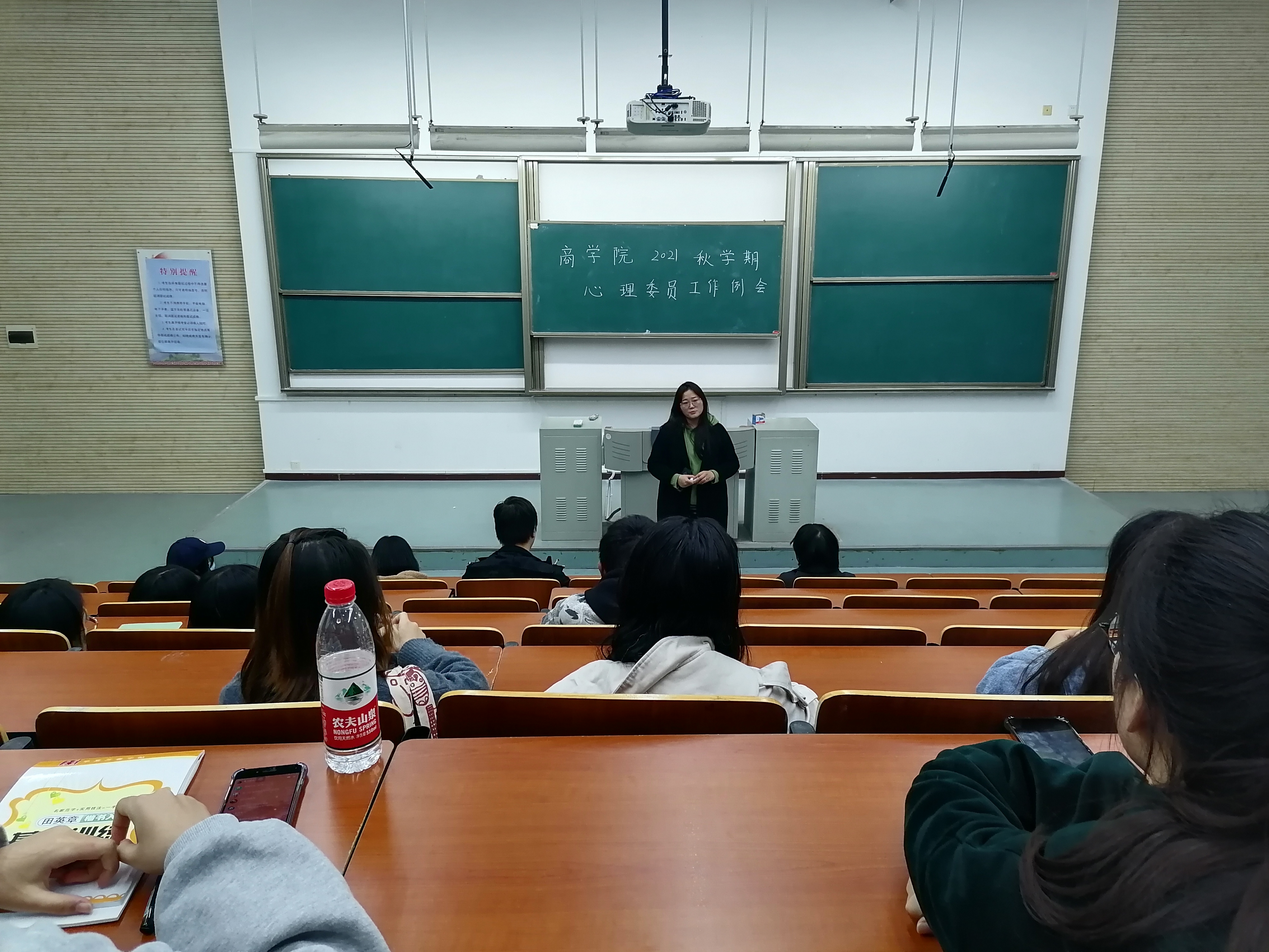 会上,强调了大学生心理健康的重要性。各班心理委员需按时、如实的汇报各班实际情况,心理委员需要参加专业培训,以便于更好的服务和帮助同学,成为老师与同学之间的纽带。范华莉老师给各班心理委员分配了任务并督促每周总结一次本班心理健康情况。