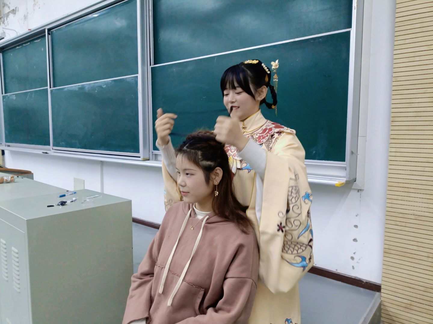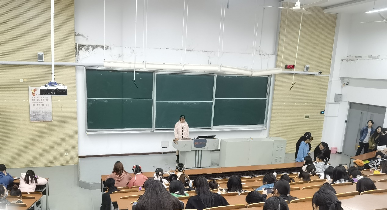 活动一经推出就深受同学们欢迎,报名参赛者络绎不绝。汉服妆容多样多式,十分讲究,展现着各朝代的特色,而这些妆容在中华传统文化中占有重要地位。因此,协会成员向在座的同学介绍了古代妆发的过程:历经时代的变迁,女子在装扮上大抵是梳髻插簪、涂脂抹粉、画眉、染甲之类,但是在不同的朝代中,女子妆容又有着各具风尚的美感,梳一个发髻,就有朝天髻、百合髻、垂鬟髻、望仙髻等几十种样式。描一双翠眉,又有涵烟眉、柳叶眉、八字眉、新月眉等几十种形状。生动形象的介绍过后,女同学们纷纷举手示意,想尝试梳一下古代妆发。随后,相关负责人给体验者单独设计了妆发,再向现场同学进行了展示。此次活动负责人表示:“我一直都对古风妆发有着极大的兴趣,平时会通过观看视频进行自学,举办此次活动也是为了让相关爱好者对古风妆容有更深入的了解,同时也想更好地宣传中国传统文化。”