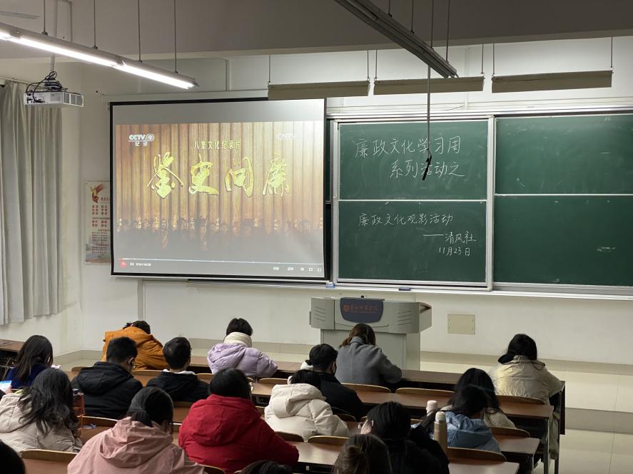 为持续加强党风廉政建设,深入推进反腐败斗争,促进同学们对红色文化的认识,在学业教育、社会主义核心价值观教育的同时,深入开展廉政文化宣传,让“廉政文化”在大学生的心里扎根,使学生知晓“敬廉崇洁,诚信知礼,律己向善,遵纪守法”,盐城师范学院清风社于11月23日在D201、D202教室举办了廉政文化观影活动。