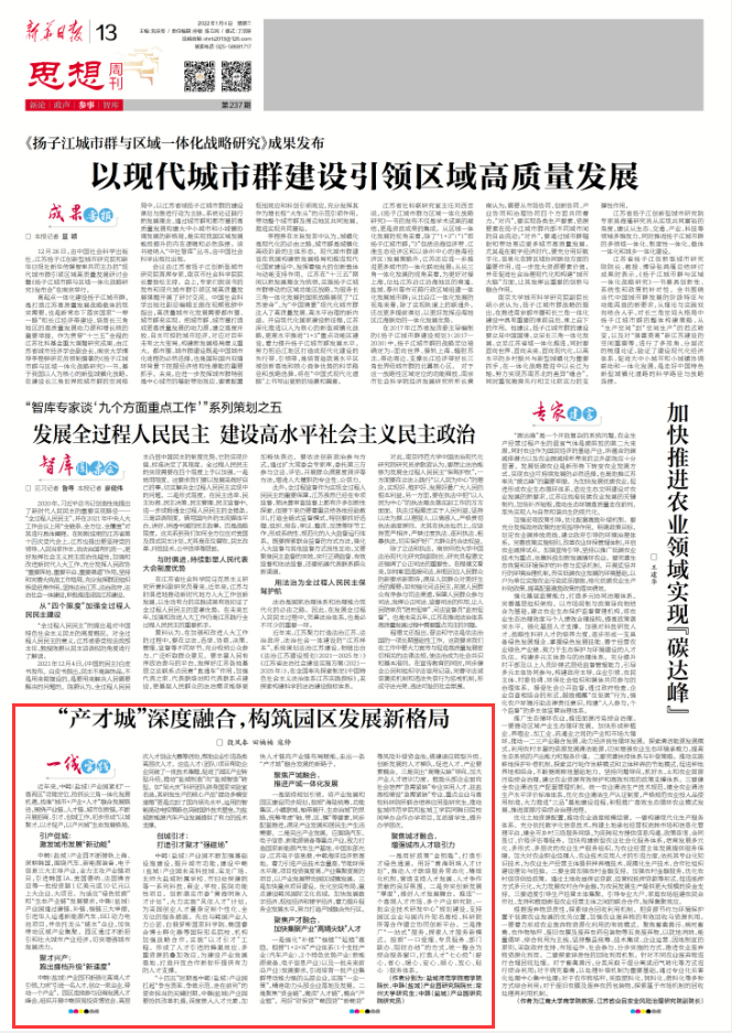我校商学院院长、中韩(盐城)产业园创新发展研究院院长殷凤春、常州大学研究生田楠楠、中韩(盐城)产业园创新发展研究院研究员寇铮博士执笔撰写的《“产才城”深度融合,构筑园区发展新格局》一文于1月4日刊发在新华日报《思想周刊》第14版。