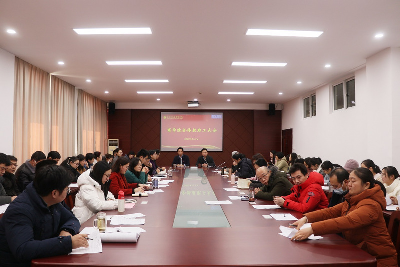1月7日下午,商学院在逸夫楼大会议室召开全体教职工大会暨2021年度年终考核工作会议,学院党委书记李明,党委副书记、院长殷凤春,党委副书记秦圣阳,副院长钱英、王力以及全体教职员工参加会议。会议由殷凤春主持。