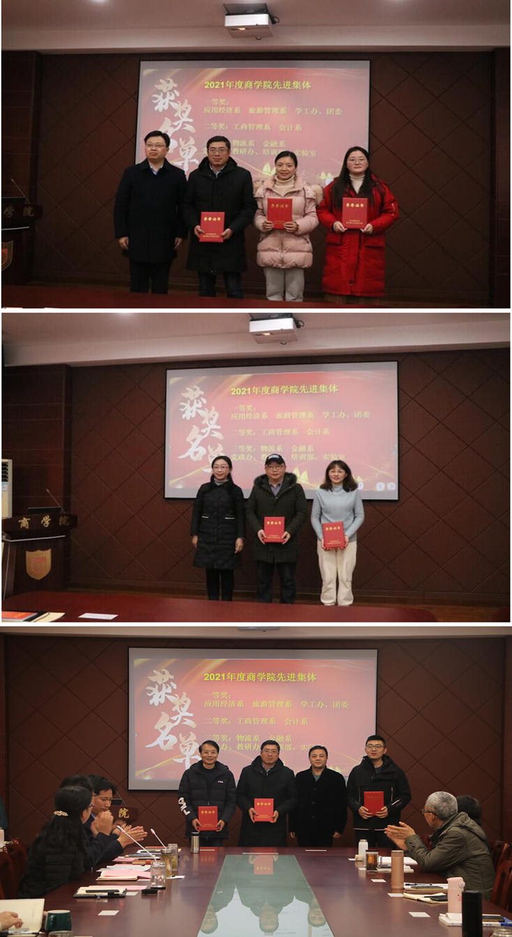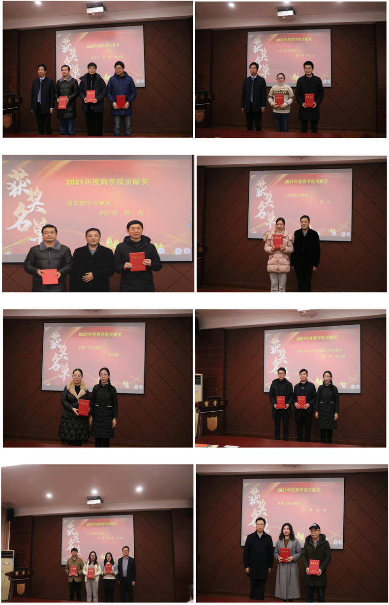 在总结表彰大会上,李明宣读了商学院2021年度表彰决定。院领导班子成员分别为2021年度先进集体奖、2020年度先进工作者、2021年度学院人才工作贡献奖、课堂教学贡献奖、专业建设贡献奖、科研工作贡献奖、智库平台与社会服务工作贡献奖、学生管理贡献奖、党建工作贡献奖等9个奖项的先进集体和先进个人颁奖。殷凤春代表学院向受表彰的集体和个人表示祝贺,向一年来在各自岗位上辛勤工作,为学院发展做出贡献的教职工们表示感谢!