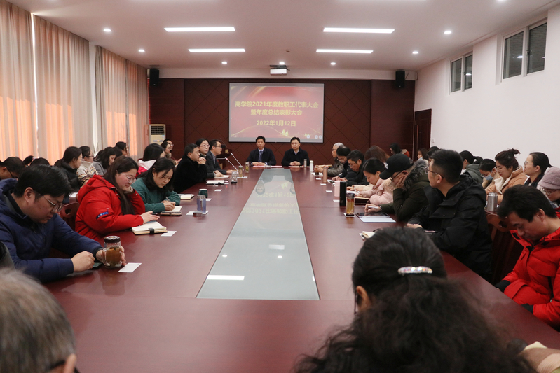 1月12日下午,商学院在逸夫楼大会议室召开商学院2021年度教职工代表大会暨年度总结表彰大会。院党委书记李明,党委副书记、院长殷凤春,党委副书记秦圣阳,副院长钱英、王力及全体教职工出席会议。会议由秦圣阳主持。