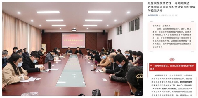 学院成立了以李明、殷凤春为组长的疫情防控工作领导小组,班子成员多次通过线上、线下会议进行整体工作部署,制定疫情防控工作方案,将学校疫情防控工作要求落到实处,落到细处。为推进工作高效、有序进行,以党支部为依托组建党员先锋岗,向全体党员发起《让党旗在疫情防控一线高高飘扬——致商学院各党支部和团体党员的疫情防控倡议书》的倡议,招募党员志愿者参与学校、学院疫情防控各项任务,充分发挥模范带头作用。