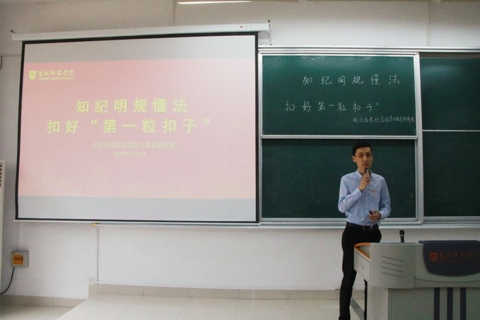 党课围绕“为什么要面向大学生开展党纪法规宣讲活动、青年学生应该遵守哪些纪律规矩、如何争做新时代遵纪守法好表率”三个方面进行讲述,准确把握“党有号召、团有行动”的丰富内涵,动员全体学生干部继续深入、精准学习全面从严治团工作的新要求。在讲到相关党纪法规红线时列举了违纪违法案件中的反面典型,他强调学生干部要从典型案例中汲取深刻教训,引以为戒。此次党课既是一堂催人奋进的廉政教育课,更是一堂振奋人心的警示教育课,通过正面引导和反面警示相结合,增强了廉政主题教育的效果。
