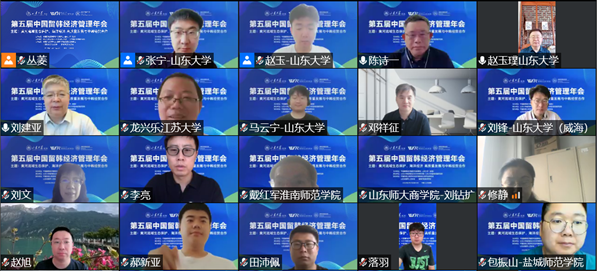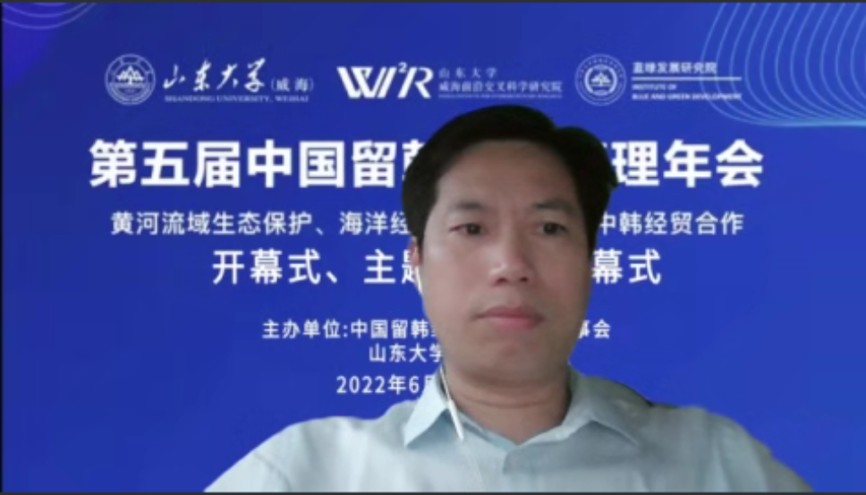 6月25日-6月26日,由山东大学威海前沿交叉科学研究院和蓝绿发展研究院承办的第五届中国留韩经济管理年会在山东大学(威海)校区以线上形式举行。中华人民共和国驻大韩民国特命全权大使邢海明,山东大学副校长、山东大学(威海)校长刘建亚,安徽大学党委副书记、常务副校长陈诗一出席论坛开幕式并致辞。山东大学(威海)副校长、欧美同学会朝韩分会副会长赵玉璞主持开幕式。我校商学院院长、中韩(盐城)产业园创新发展研究院院长殷凤春、中韩(盐城)产业园创新发展研究院研究员包振山、寇铮、朱奕学受邀参加了本次会议。