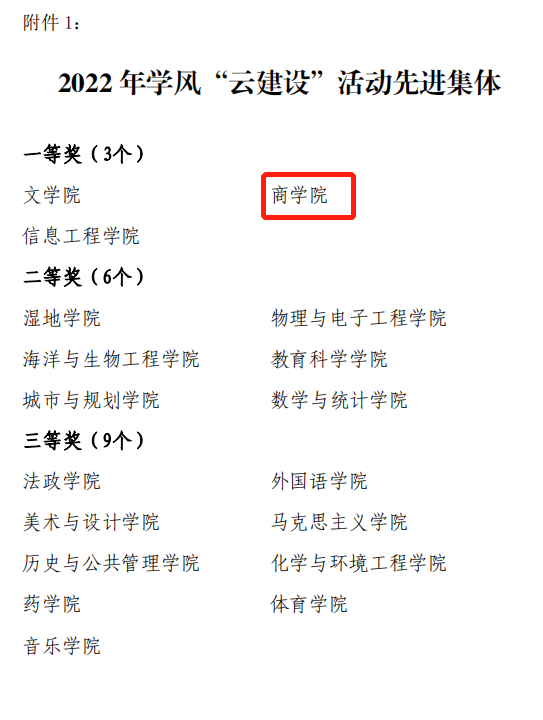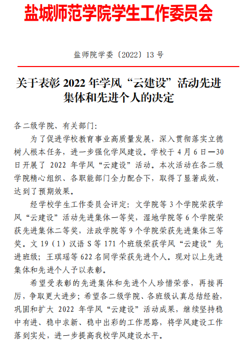 近日,学校印发《关于表彰2022年学风“云建设”活动先进集体和先进个人的决定》(盐师院学委〔2022〕13 号),对2022年学风“云建设”活动中的学风建设先进集体、先进班级和先进个人给予表彰。商学院荣获2022年学风“云建设”建设活动一等奖。