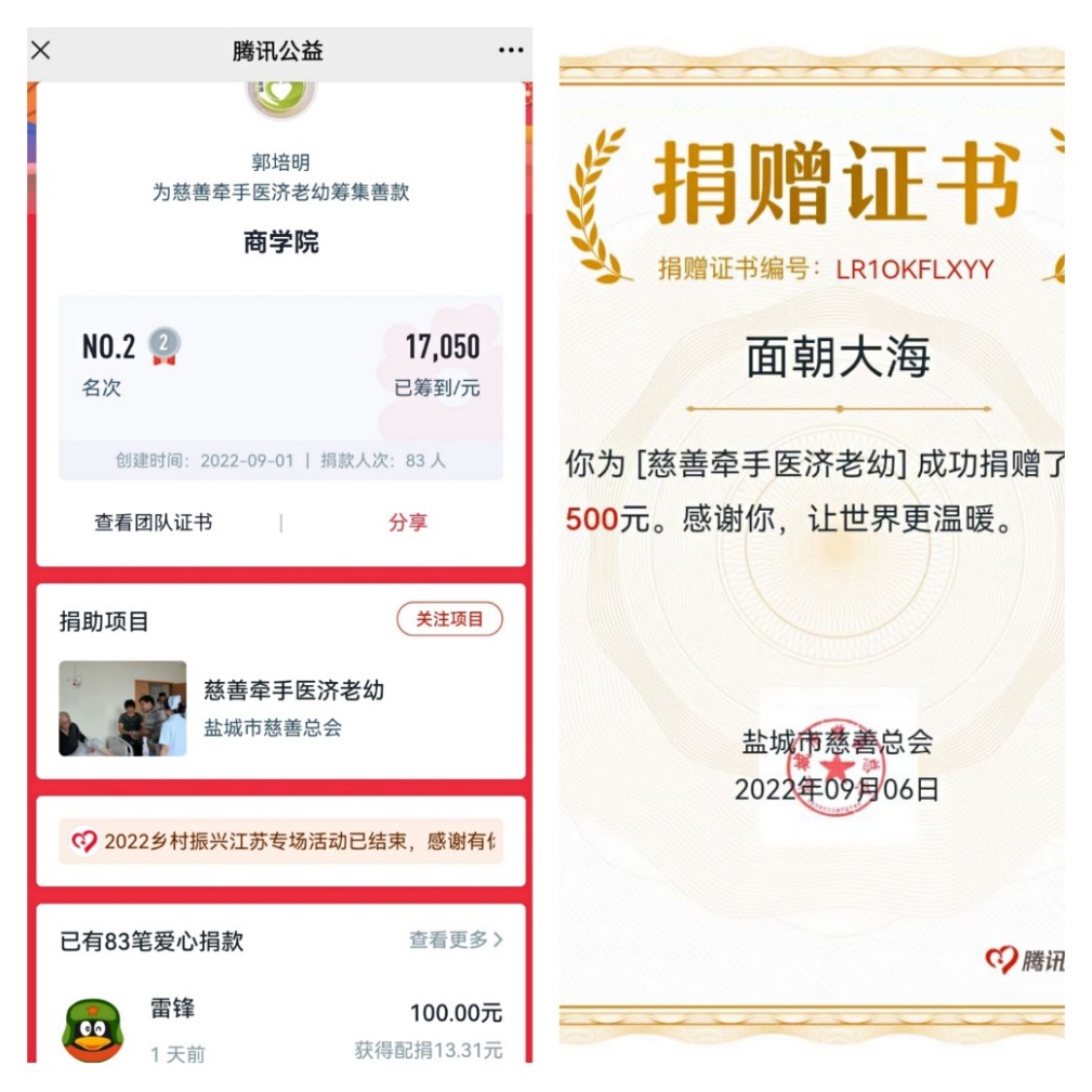 为贯彻落实《关于开展2022年市级机关、企事业单位“慈善一日捐”活动的实施方案》文件精神,商学院分工会坚持依法组织、规范有序、自愿捐款、量力而行的原则,学院领导班子示范引领,广大教师积极奉献。截止发稿,商学院教师群体通过“腾讯公益”平台募捐善款17050元,以实际行动贯彻落实习近平总书记关于促进慈善事业发展的重要批示精神,助力形成全社会“关心慈善、支持慈善、参与慈善”的良好氛围。