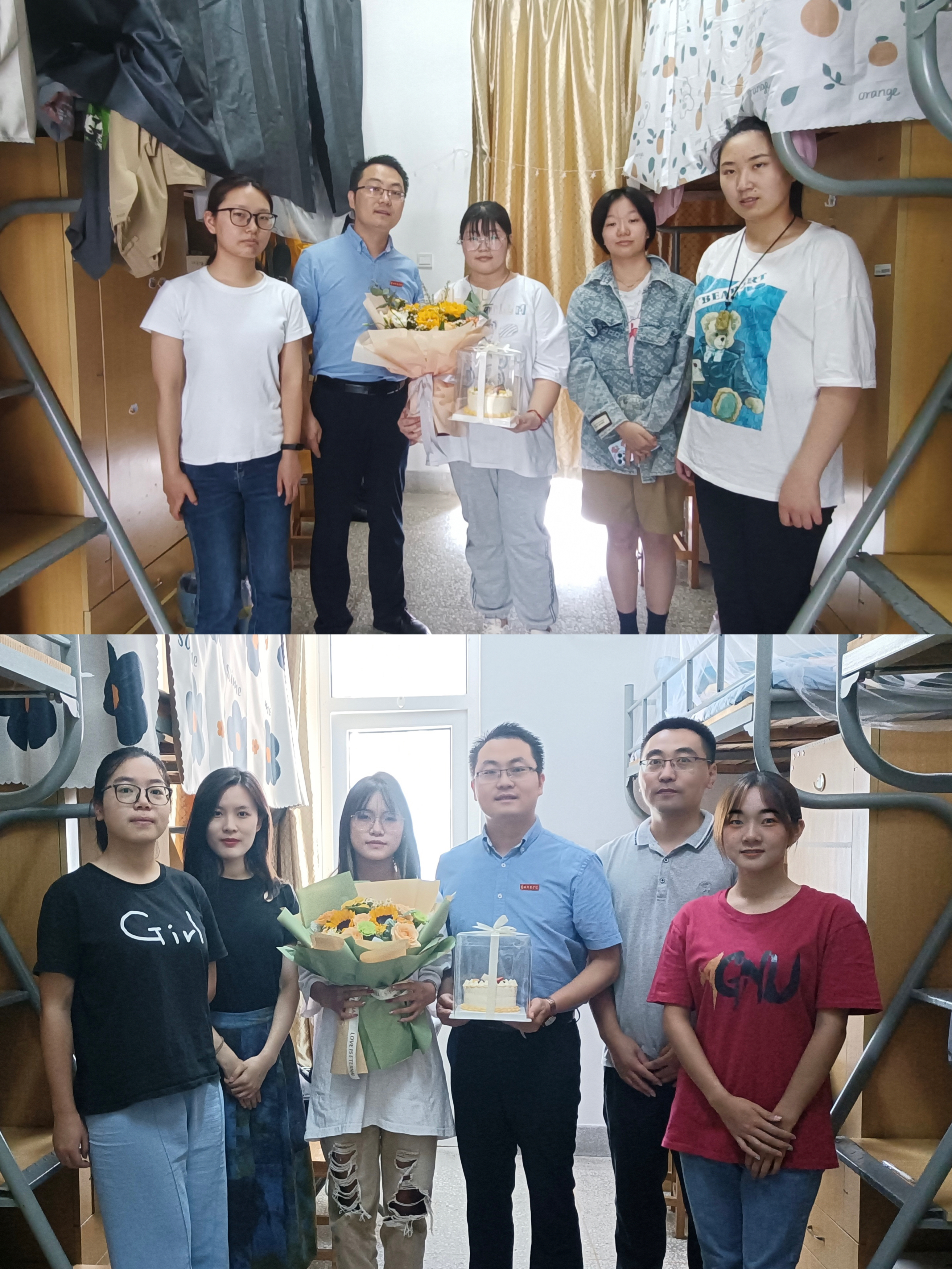 做好“暖心人”, 行动守护“润心田”。9月10日,恰逢营销224班王鑫冉、电商229班吴佳佳两位同学过生日。学院党委副书记秦圣阳来到学生宿舍,为她们送上生日蛋糕和鲜花,与新生一起畅谈开学感悟、交流入学体验,亲切地询问了她们的学习和生活状况。秦圣阳希望同学们能够更好地适应新生活,以全新的姿态、饱满的激情踏上大学新征途。吴佳佳是家庭困难的贵州民族学生,对学院的祝福十分惊喜和感谢,表示定会自强不息,牢记盐师校训,发扬盐师精神。
