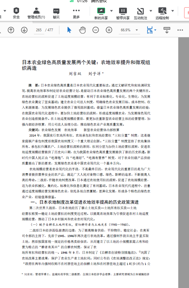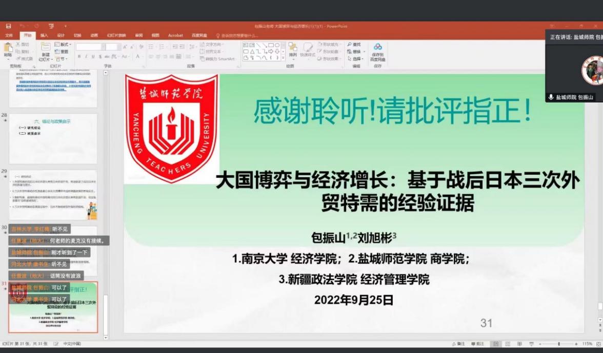会议设置了开幕式、主旨报告、分论坛和闭幕式等环节。刘吉双、包振山分别在分论坛上作了《日本农业绿色高质量发展两个关键:农地效率提升和微观组织再造》《大国博弈与经济增长:基于战后日本三次外贸特需的经验证据》论文报告,并与与会专家进行了深入交流和探讨。