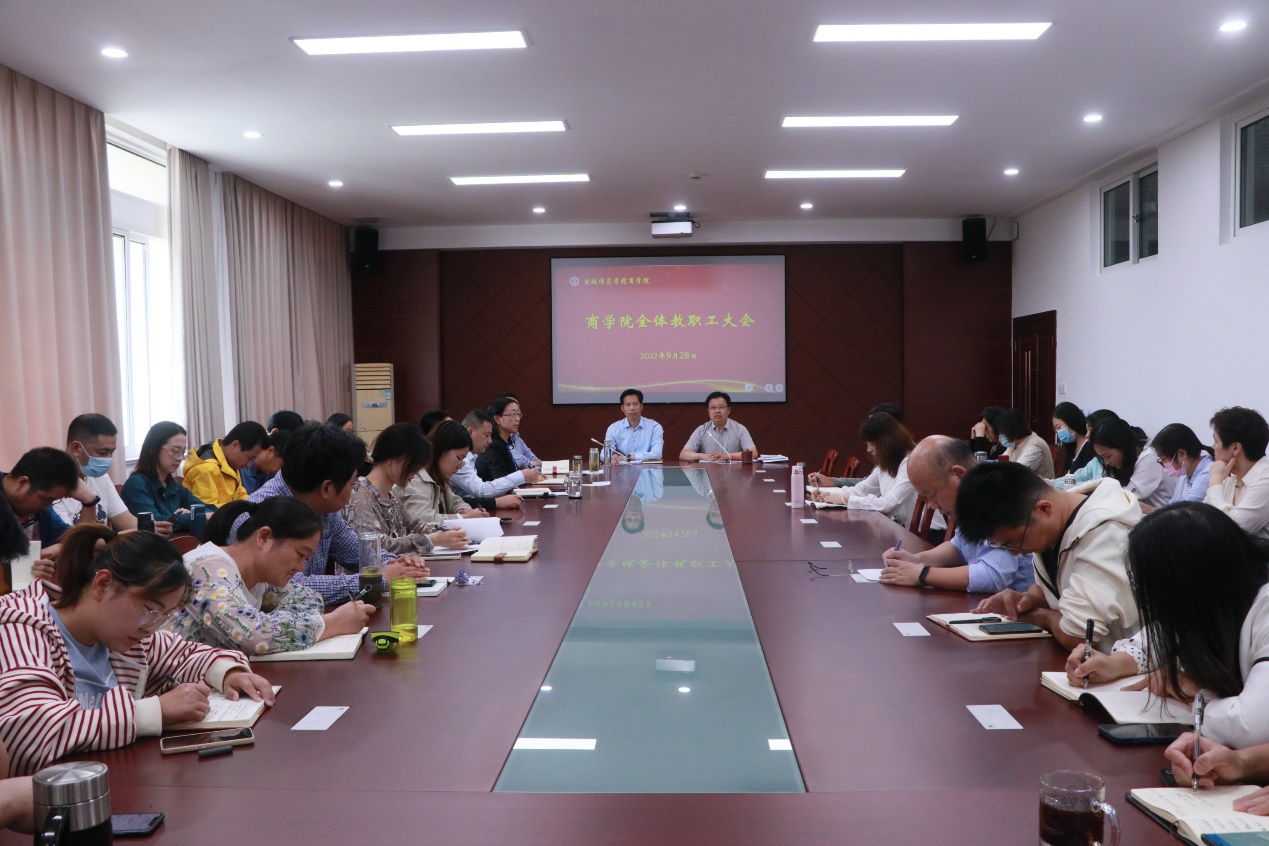 9月28日下午,商学院在逸夫楼大会议室召开全体教职工大会。学院党委书记李明,党委副书记、院长殷凤春,党委副书记秦圣阳,副院长钱英、王力以及全体教职员工参会。会议由殷凤春主持。