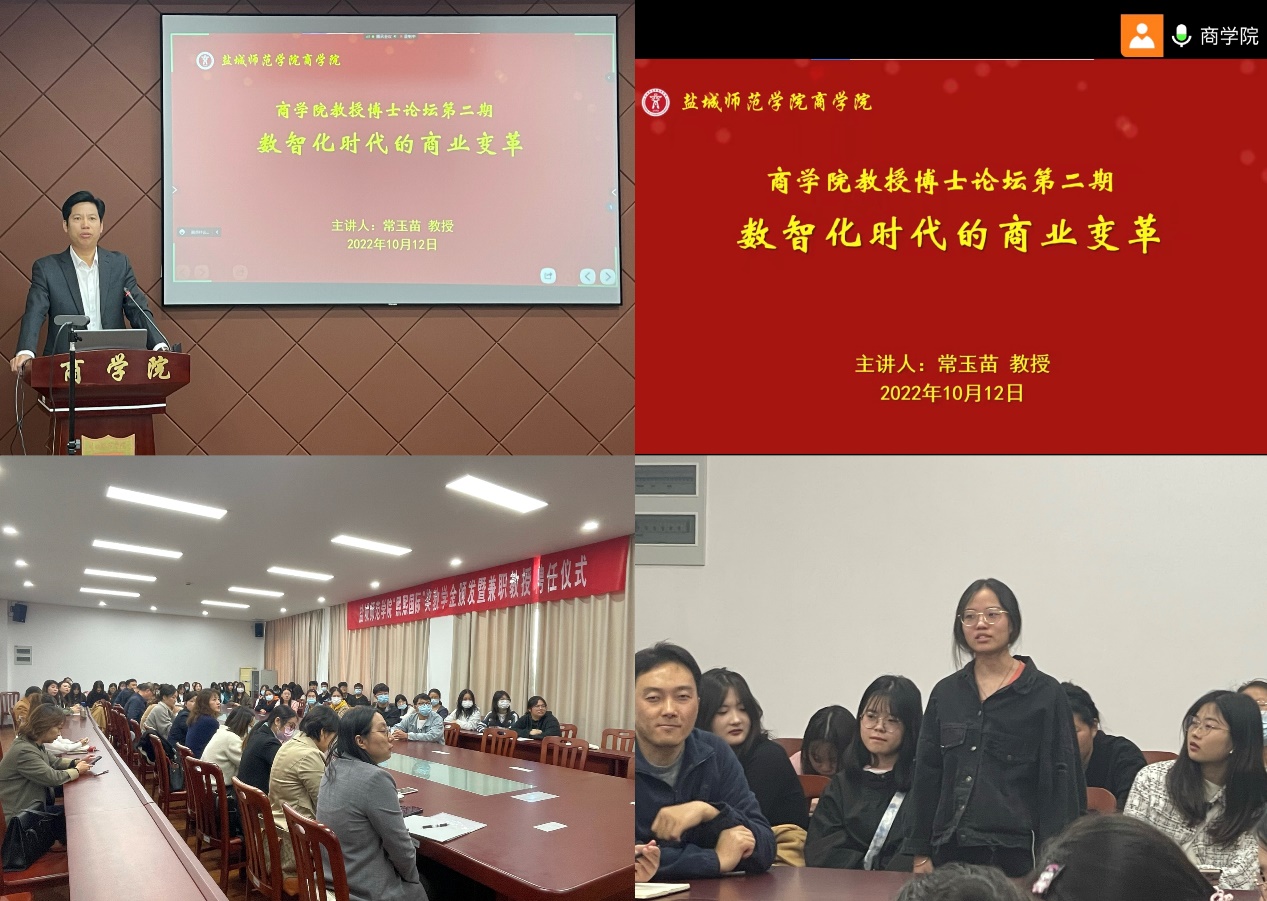 10月12日下午,商学院举办第二期教授博士论坛,商学院常玉苗教授作题为《数智化时代的商业变革》的学术报告,商学院党委副书记、院长殷凤春,副院长钱英,部分教师和学生代表300多人,以线上线下的形式共同参会,论坛由殷凤春主持。