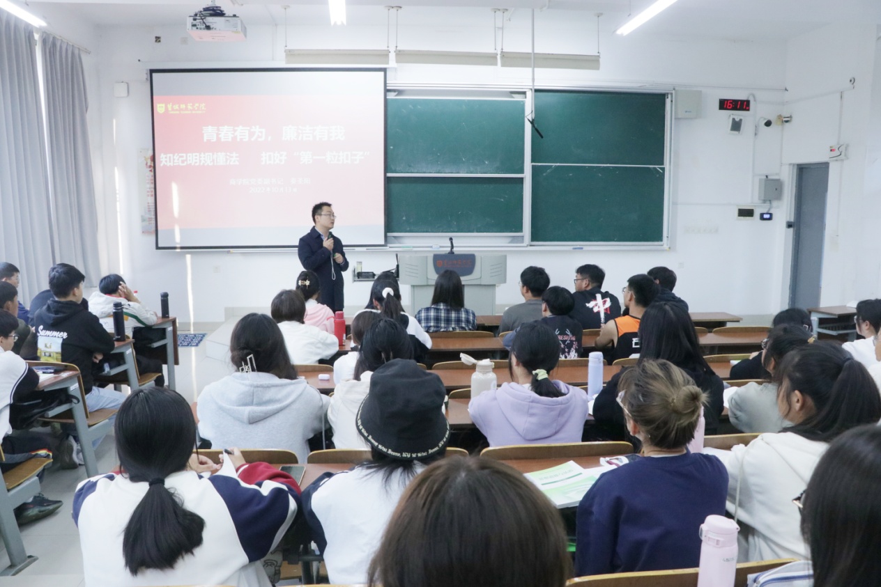 为引导新生坚定理想信念、遵守党纪法规,10月13日,商学院党委副书记秦圣阳面向全体大一新生、学生党员、学生干部开展“知纪明规懂法,扣好‘第一粒扣子’”党纪法规教育。讲座结合学院学科专业特点和学生现实情况,通过以案释法、以案明纪、以案为鉴的方式,分享了与商科专业紧密相关的法规及典型案例。通过宣讲切实提升了学生的党纪法规意识、筑牢思想防线,严守纪法规矩。