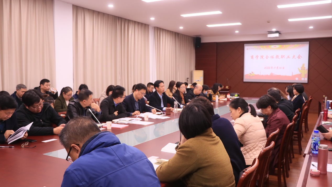 11月16日下午,商学院在逸夫楼大会议室召开全体教职工大会。学院党委书记李明,党委副书记、院长殷凤春,党委副书记秦圣阳,副院长钱英、王力以及全体教职员工参会。会议由殷凤春主持。