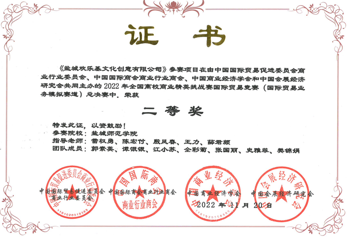 近日,在中国贸促会商业行业委员会、中国国际商会商业行业商会、中国商业经济学会和中国会展经济研究会联合主办的全国高校商业精英挑战赛国际贸易竞赛(国际贸易业务模拟赛道)全国总决赛中,我院由国际经济与贸易专业7名同学组建的队伍代表盐城欢乐基文化创意有限公司参赛,并最终荣获二等奖。