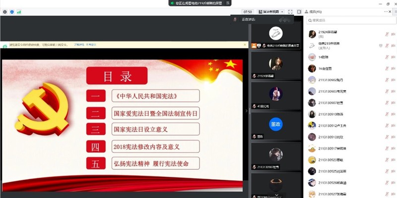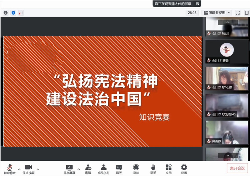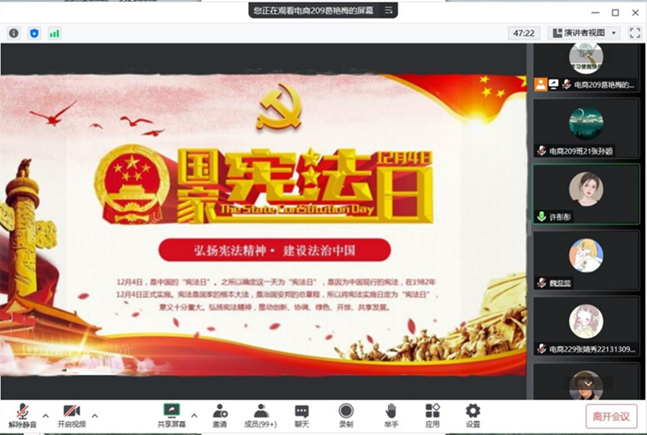 为深入开展法治宣传教育,商学院开展线上主题宣讲活动。辅导员许彤彤带领同学们回顾了新中国的立法史,了解中国宪法的变迁,熟悉了宪法的基本内容,强调宪法是立国之法宝、强国之重器,要求学生牢固树立对宪法和法律的真诚信仰,大力弘扬宪法精神,维护宪法权威,自觉做宪法的忠实尊崇者、自觉践行者和坚定捍卫者,以实际行动履行宪法赋予的神圣职责,切实担负起新时代赋予的使命和担当。