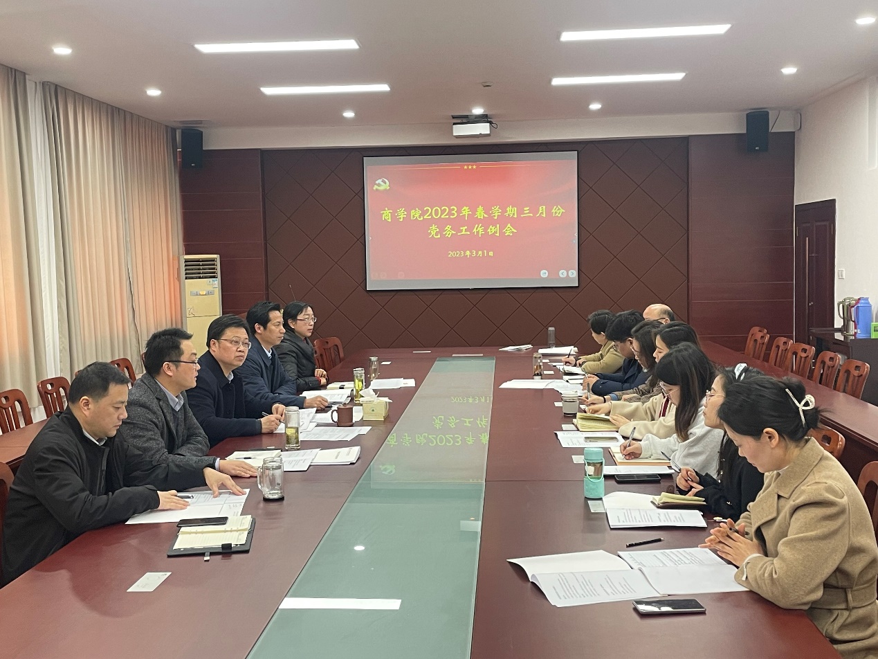 3月1日上午,商学院在大会议室召开三月份党务工作例会。学院党委书记李明,党委副书记、院长殷凤春,党委副书记秦圣阳,副院长钱英、王力,各支部书记参加会议。会议由李明主持。