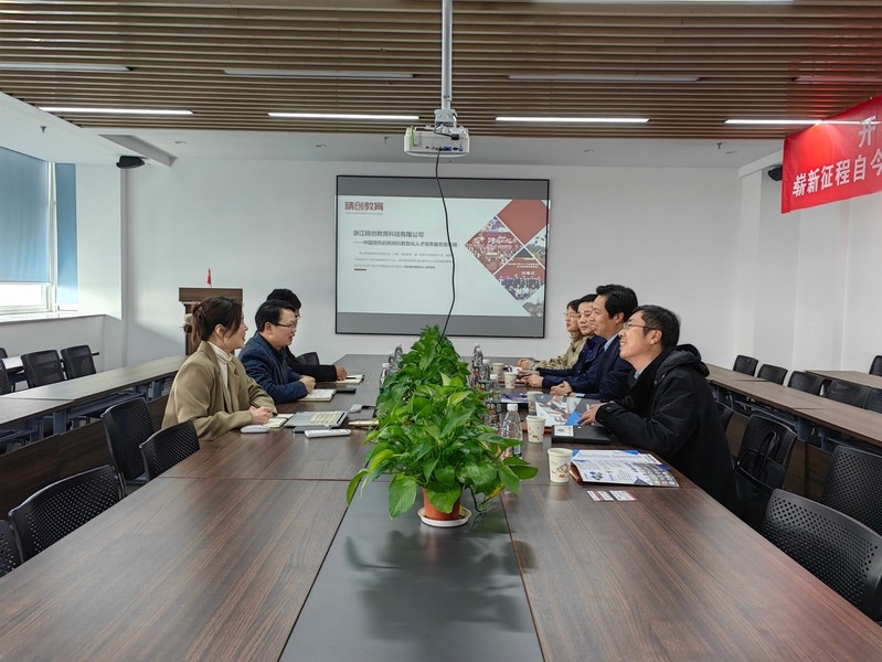 在浙江精创教育科技有限公司,总经理蒋定福、营销部经理姜其斌等详细介绍了公司的发展历程、业务范围和未来方向。双方就共建产业学院展开深入交流。殷凤春希望双方能进一步加强合作,特别是在全国A类竞赛、数智化教学平台建设、高水平课程、教材建设、教学成果奖培育等方面进行实质性合作,共同推动产业学院落地落实。交流会上,双方达成多项合作协议,浙江精创教育科技有限公司总经理蒋定福当场表示无偿捐赠相关教学平台软件供学院师生使用。