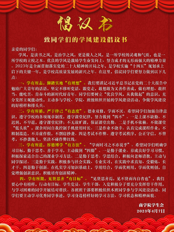 商学院学工办主任范华莉传达了《关于开展2023年学风建设月活动的通知》(盐师院学委〔2023〕5号)文件精神,对各项考核指标进行了解读。会议要求要以此次学风建设月活动为契机,以党建抓学风、以思政育学风、以读书带学风、以规划领学风、以预警推学风、以管理正学风、以特色促学风,增强学习纪律,提高学习质量,营造良好的学习氛围,促进学生成长成才。