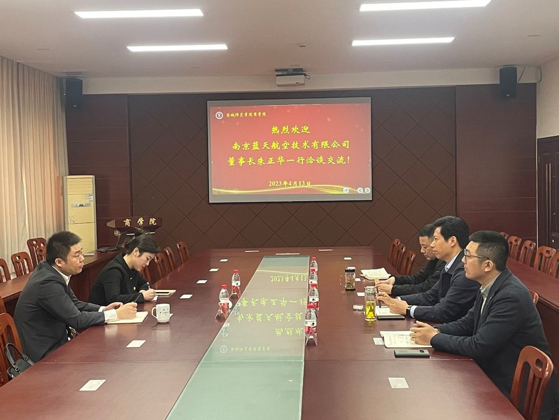 4月13日上午,南京蓝天航空技术有限公司董事长朱正华一行2人来到商学院洽谈航空服务艺术与管理专业共建事宜。商学院党委副书记、院长殷凤春,副院长王力,教研办副主任许頔参加洽谈。