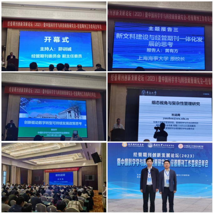 5月12日--13日,经管期刊创新发展论坛(2023)暨中国科学学与科技政策研究会--经管期刊工作委员会年会在南昌大学召开。本次论坛由中国科学学与科技政策研究会--经管期刊工作委员会主办,南昌大学经济管理学院和江西师范大学财政金融学院承办,并由《中国软科学》《科研管理》《科学管理研究》《南开经济研究》等国内百余家经济学、管理学权威期刊共同支持。来自全国百余所大学校长、商学院(经管学院)的院长、科研处长及中青年学者400余人参加了本次论坛。我校商学院院长、中韩(盐城)产业园创新发展研究院院长殷凤春、包振山博士参加了会议。