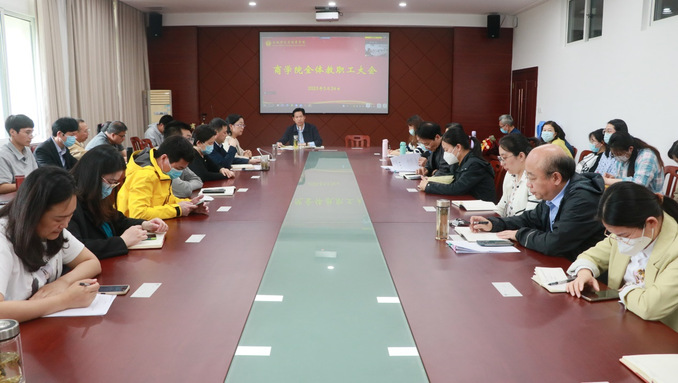 5月24日下午,商学院在逸夫楼三楼大会议室召开全体教职工大会。本次会议采用“线下+线上”的形式进行,学院党委书记李明,党委副书记、院长殷凤春,党委副书记秦圣阳,副院长钱英、王力以及全体教职员工参会。会议由殷凤春主持。