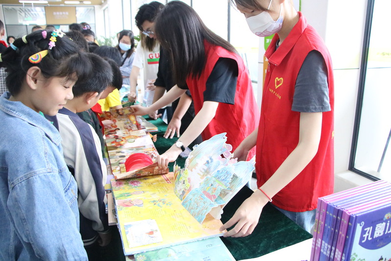 仪式结束后,商学院师生志愿者围绕“童心童趣、童书共享、童心向党”等主题,开展了“弘扬志愿精神,共建书香社会”志愿服务活动。志愿者给孩子们介绍了创智图书馆、少儿数字图书馆、AR体验馆等,指导大家体验桌球、拼图、数字阅读、AR的奇妙与乐趣,并与孩子们一起制作无障碍图书。