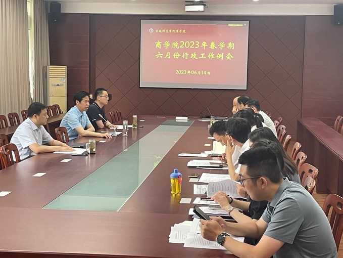 6月14日上午,商学院在大会议室召开六月份行政工作例会。学院党委副书记、院长殷凤春,党委副书记秦圣阳,副院长王力,各系部负责人参加会议。会议由殷凤春主持。