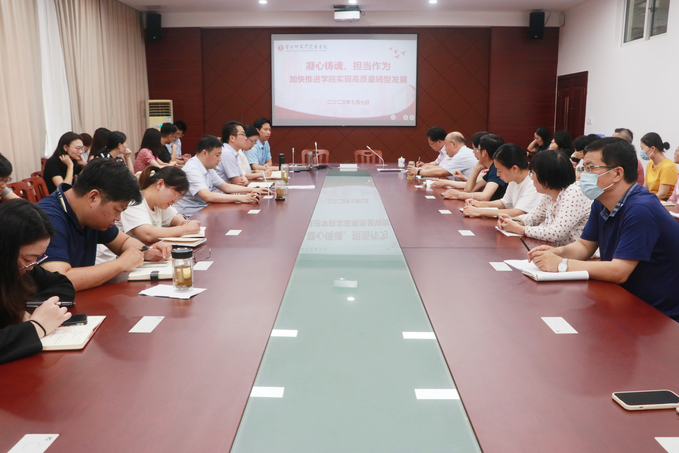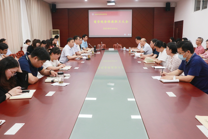 7月7日下午,商学院在逸夫楼三楼大会议室召开全体教职工大会。学院党委书记李明,党委副书记、院长殷凤春,党委副书记秦圣阳,副院长钱英、王力以及全体教职员工参加会议。会议由殷凤春主持。