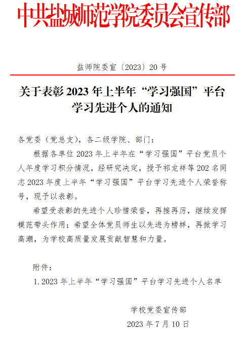 近日,学校印发《关于表彰2023年上半年“学习强国”平台学习先进个人的通知》(盐师院委宣〔2023〕20号),对2023年上半年各单位在“学习强国”平台党员个人年度学习积分中取得优异成绩的先进个人进行表彰。李梁、雷权勇、钱英、郝宇佳、万良杰、秦圣阳、王雅青、王倩、许彤彤、周华、王黎、王力、张雪、纪峰、陈莉、李明等16名同志荣获2023年上半年“学习强国”平台学习先进个人荣誉称号。