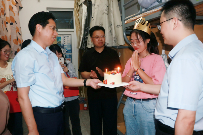 “家是哪个地方的?”“来到学校还适应吗?”“食堂饭菜吃的习惯吗?”每到一个学生宿舍,学院领导都会主动询问新生入学后的各方面情况,关心学生的衣食住行和入学后的适应情况,并用心叮嘱同学积极适应大学生活,利用好大学时光,加强寝室文化建设,严格遵守学校纪律,守好安全底线。宿舍走访中,还有两间特殊的老兵宿舍,回到校园的他们,用军人的英姿起到带头模范作用。宿舍中,他们延续着军队的优良作风,被子叠成“豆腐块”,鞋子摆成一条线,生活用品摆放得整整齐齐,战友间的情谊让他们相聚在同一间宿舍,“退伍不褪色”成为他们共同的追求。今天,恰巧10A316孙晓帆同学过生日,学院为“小寿星”送上了蛋糕和祝福庆祝生日,为她过了一个难忘的生日。同学们纷纷表示刚入学就收到老师们的关心倍感温暖和鼓舞,接下来会尽快适应新环境,以最佳的状态投入到大学的学习生活,努力实现自身理想。