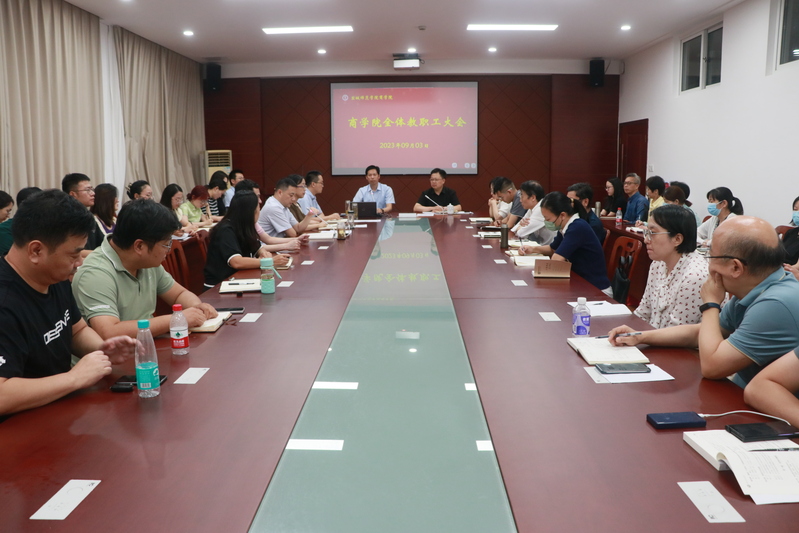 9月3日下午,商学院在逸夫楼大会议室召开2023年秋学期第一次全体教职工大会。学院党委书记李明,党委副书记、院长殷凤春,党委副书记秦圣阳,副院长钱英、王力以及全体教职员工参会。会议由殷凤春主持。