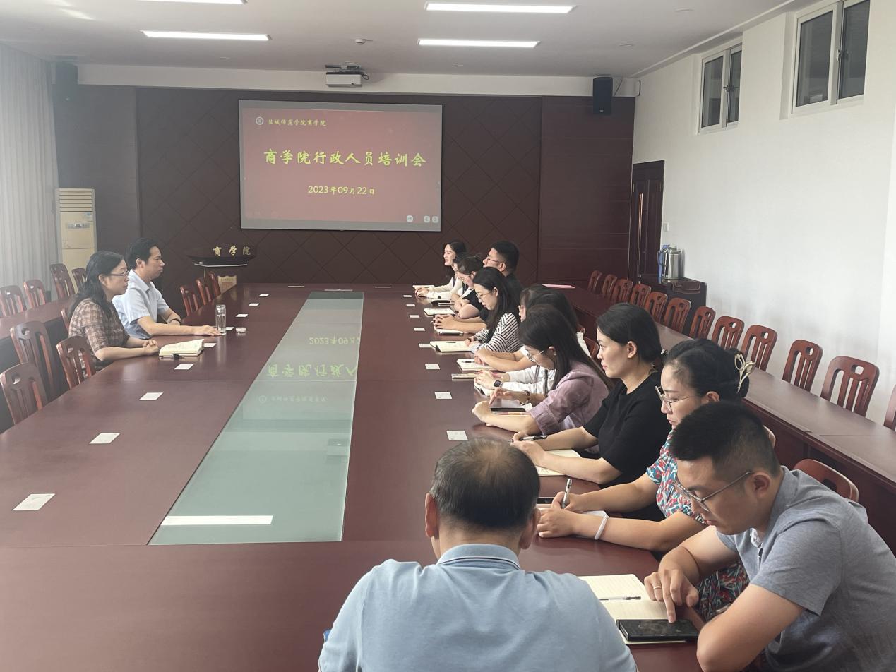 9月22日上午,商学院在逸夫楼大会议室召开行政人员培训会。学院党委副书记、院长殷凤春,党委副书记秦圣阳,副院长钱英,全体行政工作人员参加会议。会议由殷凤春主持。