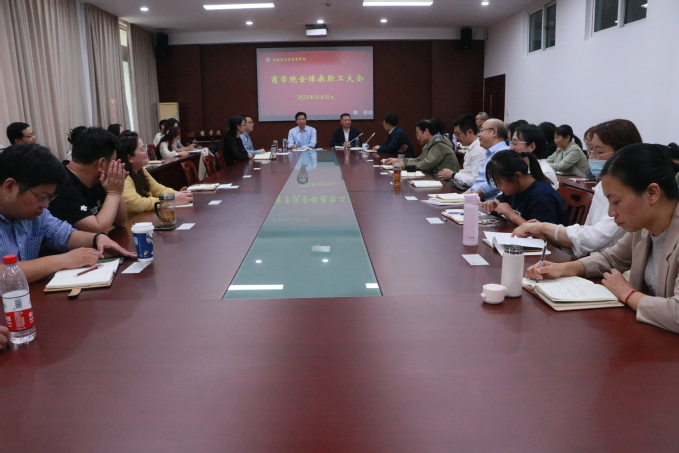 10月18日下午,商学院在逸夫楼大会议室召开全体教职工大会。学院新老领导班子成员及全体教职工参加会议,会议由学院党委副书记、院长殷凤春主持。