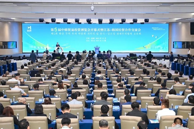 11月3日上午,以“绿色开放合作,科创共享未来”为主题的第五届中韩贸易投资博览会开幕式暨江苏--韩国经贸合作交流会在盐城国际会议中心隆重开幕。江苏省人民政府省长许昆林、韩国驻华大使郑在浩、中国贸促会副会长于健龙、韩国产业通商资源部本部长安德根、中国商务部亚洲司司长王立平、韩国贸易协会专务理事金高铉出席并致辞。省政府秘书长吕德明,韩国驻上海总领事金英俊,来自中韩等国政府部门负责人、专家学者、企业家400余人参加活动。盐城市委书记周斌主持开幕式。