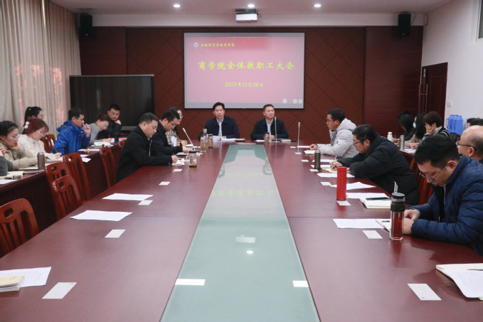 12月6日下午,商学院在逸夫楼大会议室召开全体教职工大会暨政治理论学习会。学院党委书记刘振亚,党委副书记、院长殷凤春,党委副书记秦圣阳,副院长钱英、王力以及全体教职员工参加会议。会议由殷凤春主持。