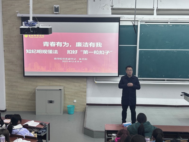 为持续推进新生入学教育,全面加强大学生的党性党风党纪教育,营造风清气正的校园氛围。12月14日,商学院党委副书记秦圣阳在公共教学楼C202教室面向大一新生开展“知纪明规懂法,扣好‘第一粒扣子’”党纪法规教育。