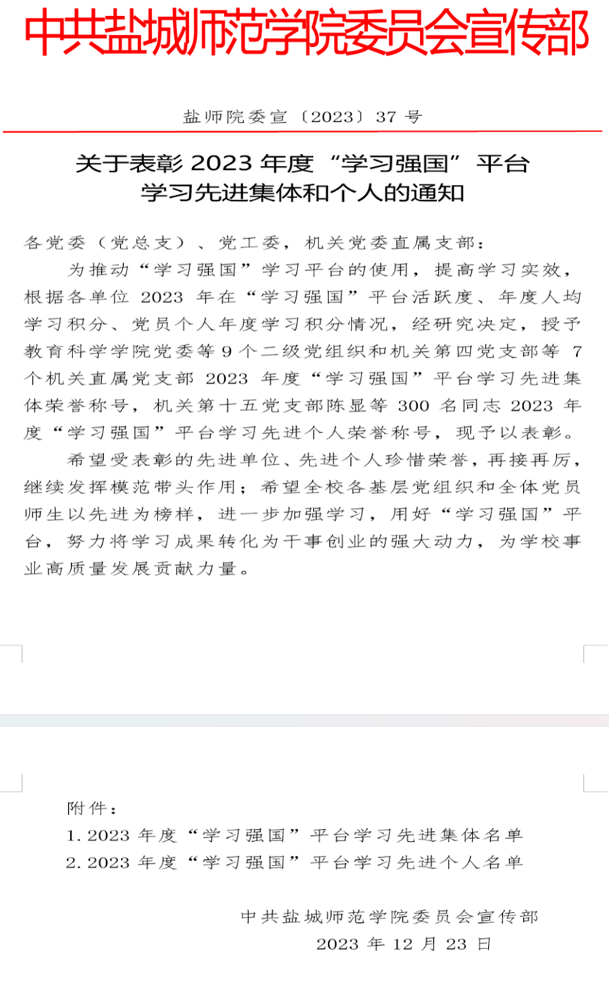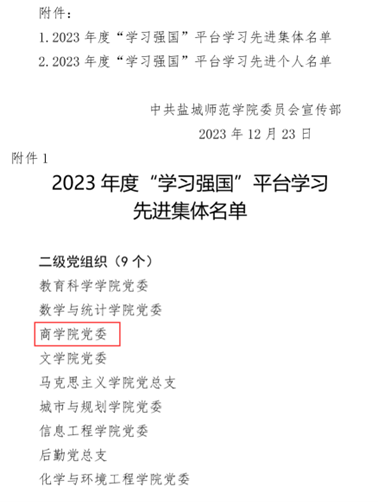 近日,学校印发《关于表彰2023年度“学习强国”平台学习先进集体和个人的通知》(盐师院委宣〔2023〕37号)对2023年度各单位在“学习强国”平台学习的活跃度、年度人均学习积分和党员个人年度学习积分中取得优异成绩的先进集体和先进个人进行表彰。商学院党委荣获2023年度“学习强国”平台学习先进集体荣誉称号;雷权勇、李梁、万良杰、钱英、郝宇佳、王雅青、许彤彤、王黎、秦圣阳、王倩、王力、周华、张雪、纪峰、陈莉、李明、蒯小群、张萍萍、朱兵、左萌等20名同志荣获2023年度学习强国”平台学习先进个人荣誉称号。