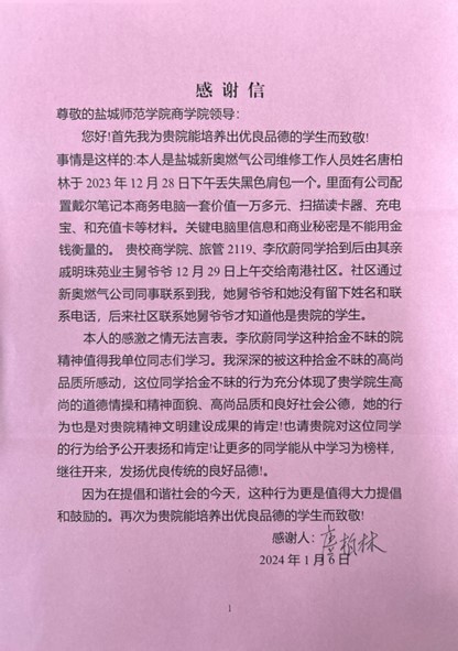 1月15日上午,盐城新奥燃气公司维修工作人员唐柏林向盐城师范学院商学院送上一幅锦旗和一封感谢信,信中满溢感谢之情,向旅游管理2119班李欣蔚同学做好事不留名、拾金不昧的行为表示感谢。