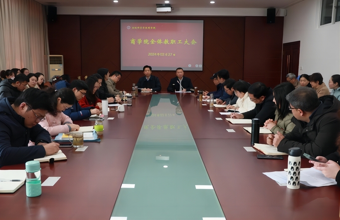 新春伊始,万象更新。2月27日下午,商学院在逸夫楼大会议室召开2024年春学期第一次全体教职工大会。学院党委书记刘振亚,党委副书记、院长殷凤春,党委副书记秦圣阳,副院长钱英、王力以及全体教职员工参加会议。会议由殷凤春主持。