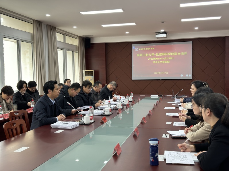 3月17日,我院举行2022级南京工业大学-盐城师范学院联合培养会计硕士(MPAcc)研究生学位论文预答辩。答辩委员会由盐城工学院经济管理学院院长赵永亮、副院长李争光,我校学科办主任、研究生处处长曹明,商学院万良杰教授共4人组成,赵永亮担任答辩组组长。8名研究生及其导师参加了会议。