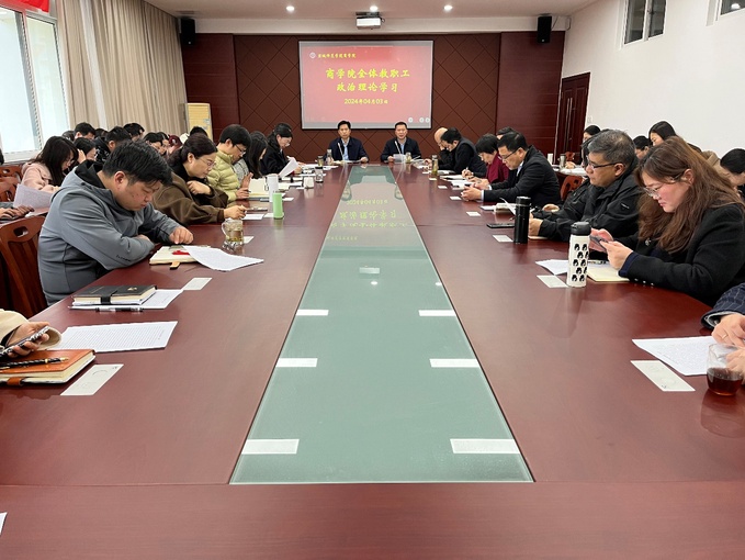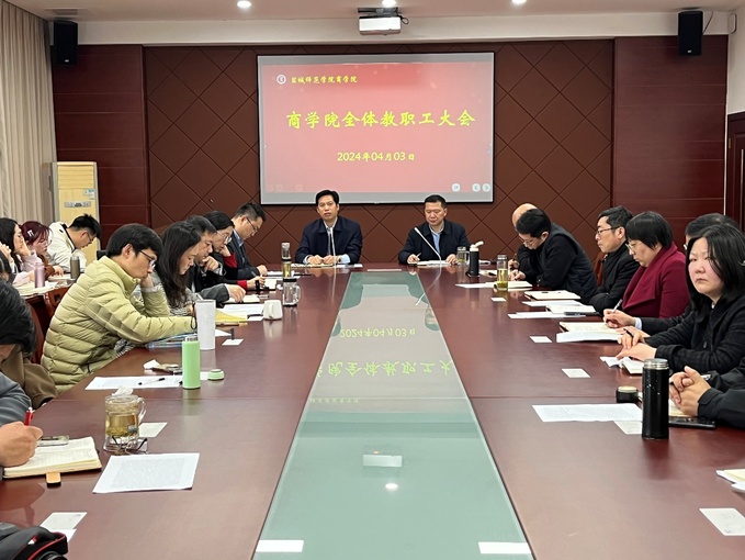 4月3日下午,商学院在逸夫楼大会议室召开全体教职工大会暨政治理论学习会。学院党委书记刘振亚,党委副书记、院长殷凤春,党委副书记秦圣阳,副院长钱英、王力以及全体教职员工参加会议。会议由殷凤春主持。