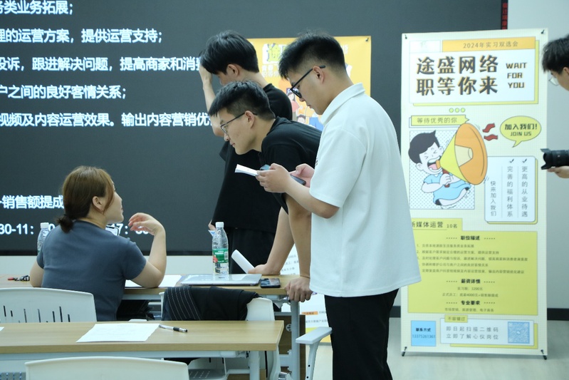 第二个环节即互动问答和现场面试。此次途盛网络科技有限公司招聘的岗位有新媒体运营、OTA专员和市场专员。同学们带着简历,与途盛团队交流实习岗位信息。途盛工作人员耐心解答并初步面试。此次双选会是商学院首次专场,效果显著,现场热烈有序。双选会后,老师表示学校将提供签约指导,途盛公司也将提供支持,确保签约顺利。据悉,通过面试我院21级学生已有近二十人与途盛公司达成了初步实习意向。