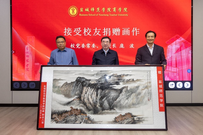 庞波代表学校接受财会82(8)班班长高振儒、团支书卢明军向母校赠送的画作,并向他们颁发“校友林·班级树”认养证书。商学院党委副书记、院长殷凤春介绍商学院在人才培养、科学研究、社会服务和文化传承等方面取得的突出成绩,并详细说明了商学院未来发展规划。