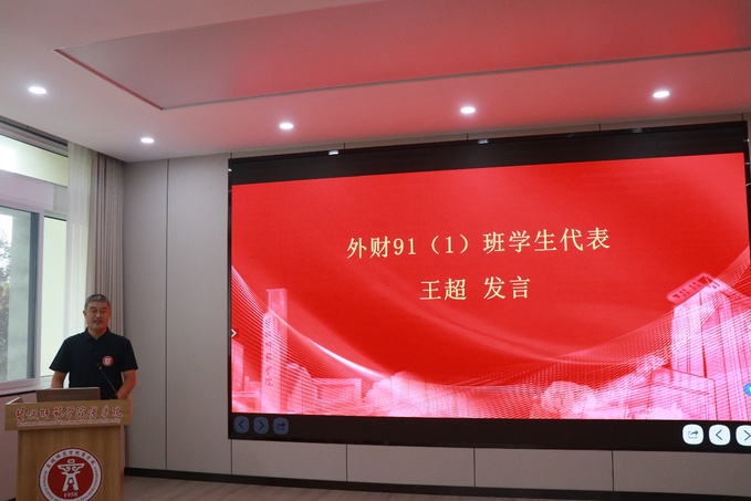 庞波代表学校接受了校友认养的“校友林·班级树”。商学院、数字经济学院党委副书记、院长殷凤春介绍了学院高质量发展情况及未来发展规划。外财91(1)班班主任、无锡商业职业技术学院党委副书记、校长徐汉文深情回忆了师生相处的难忘时光,对校友们毕业后取得的成绩深感欣慰。校友代表、外财91(1)班班长王超分享了自己在母校的求学经历和工作后的成长历程,表达了对母校培育和恩师教诲的深切感恩。会上,商学院、数字经济学院领导接受了校友捐赠的横匾。