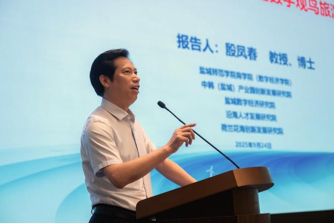 研讨会上,殷凤春作题为《海洋疗愈性景观视角下黄海湿地数字观鸟旅游高质量发展》的专题报告。他从海洋疗愈性景观视角出发,结合盐城黄海湿地世界自然遗产的资源禀赋优势、区位优势、政策优势,剖析了观鸟旅游经济面临生态敏感高、体验模式单一、科技融合不深、疗愈价值未凸显等方面的挑战,提出应打造梯度化、沉浸式的数字疗愈系列产品、构建云端+线上无缝衔接的韧性空间格局、打造“滨海湿地印象”系列品牌、拓展观鸟+融合发展的价值产业链等建议。整个报告资料翔实、视角独特、紧扣盐城观鸟旅游经济发展实际,受到与会嘉宾的热议与好评。